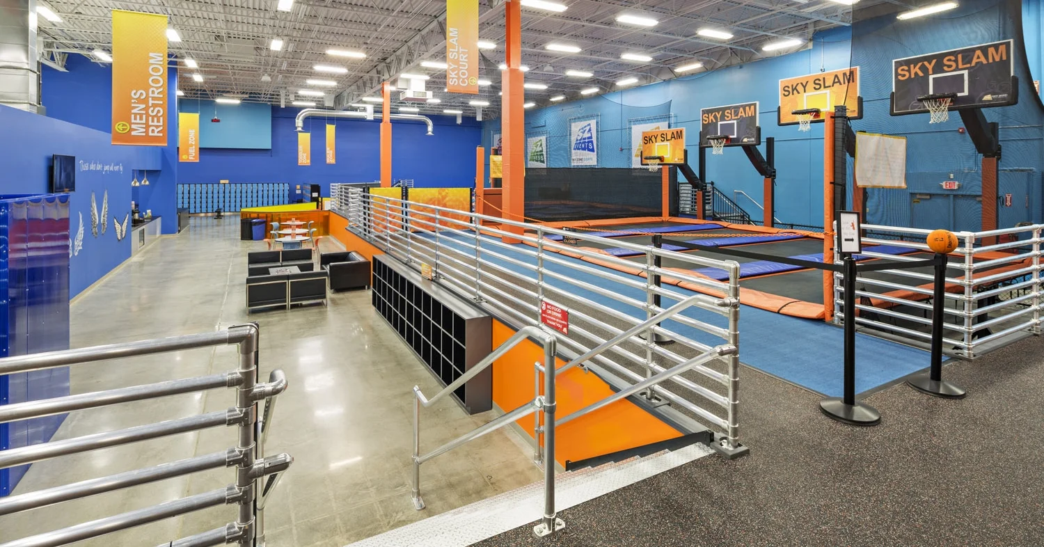 Embarc Studio designed this new 40,000 square foot indoor trampoline park in Danvers, MA. This cost effective design solution involved the renovation of an existing big box retail space where the tall ceiling heights provided the clearance needed above the trampolines while also allowing a viewing mezzanine to be constructed within the space.