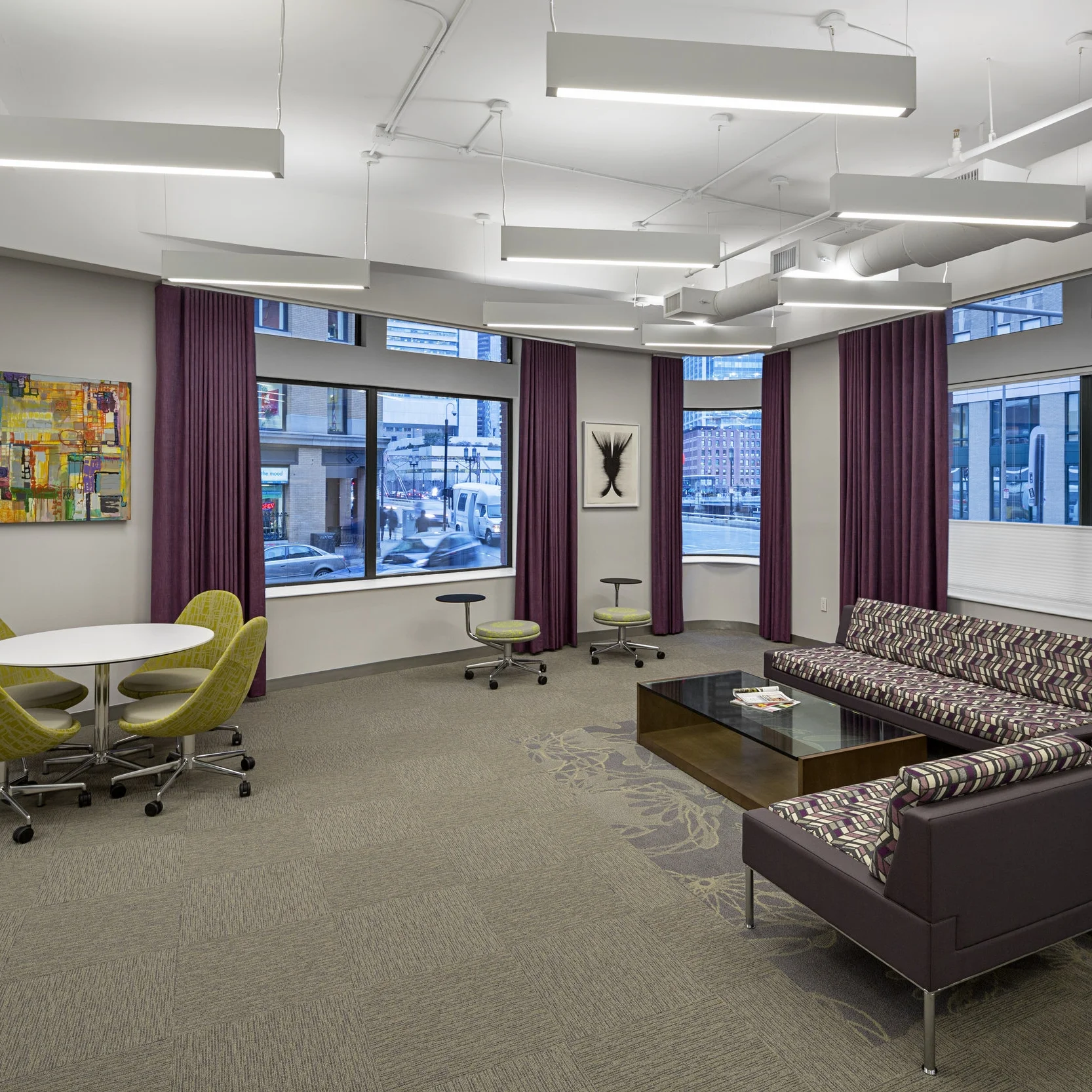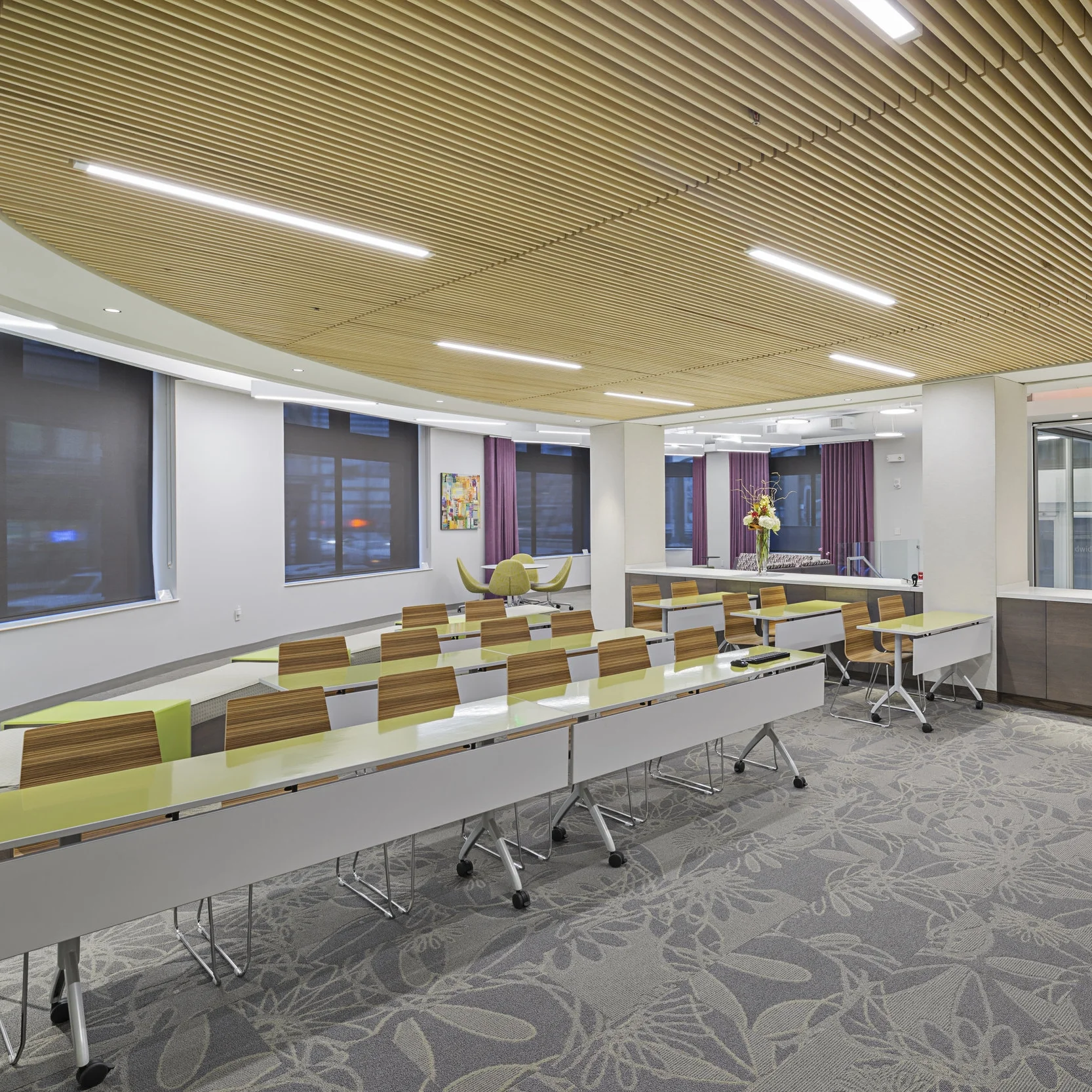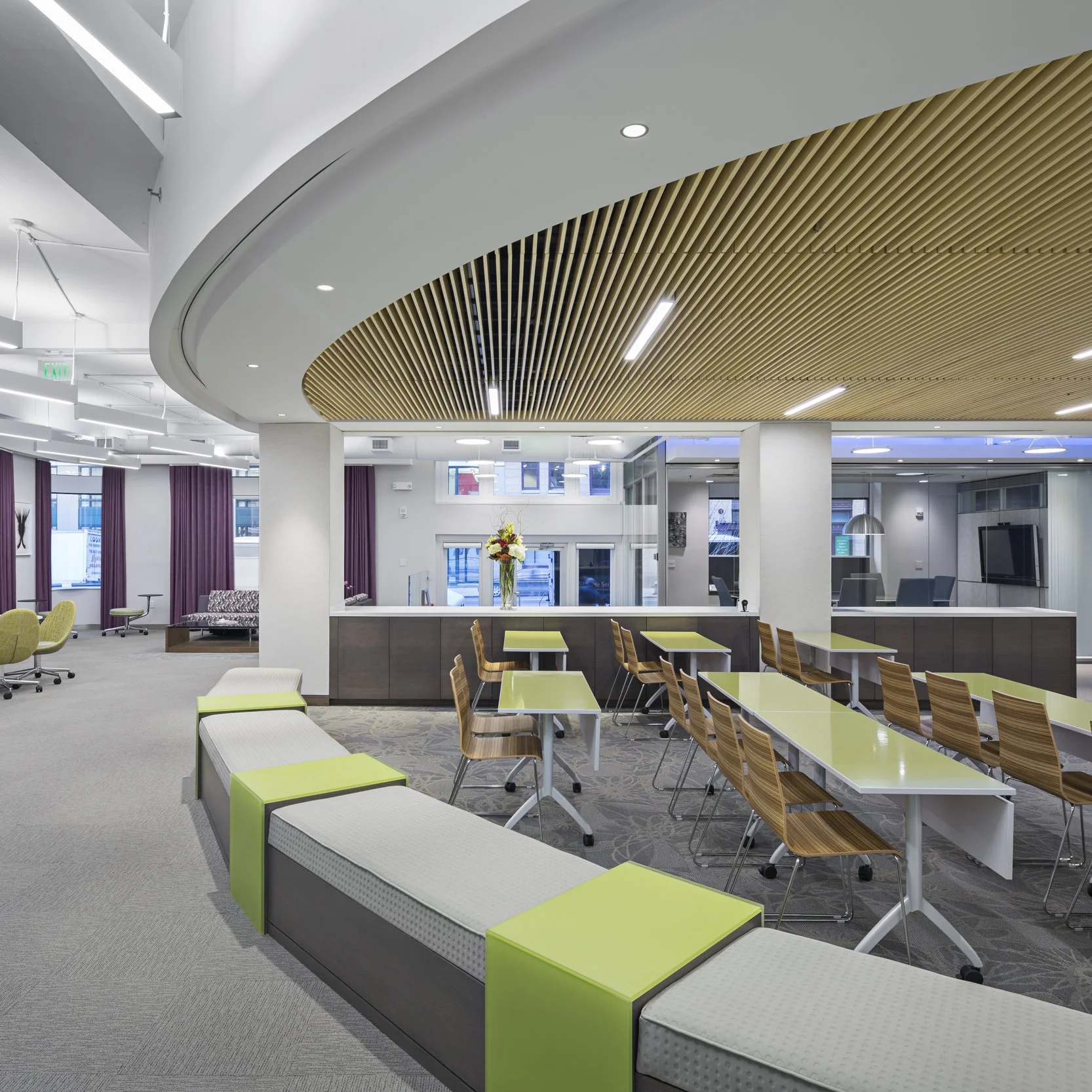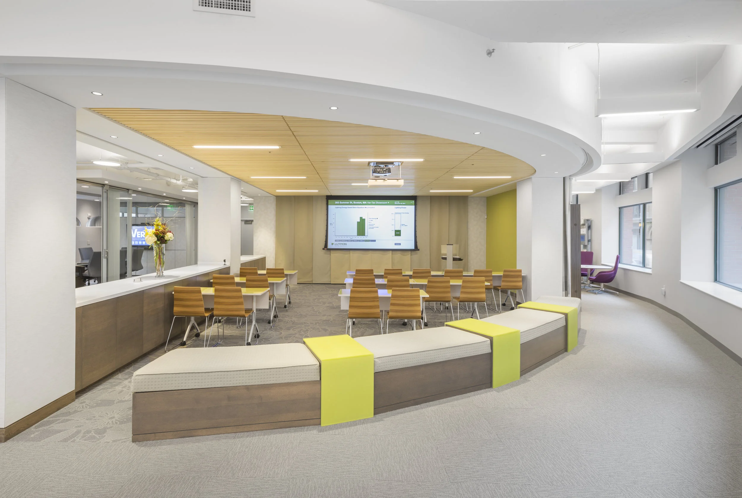 Renovation and fit-out of a new showroom for Ver-Tex Shade | Light Solutions in historic Fort Point. Centrally located in the showroom is the Ver-Tex Learning Center, automated with a curved track drapery system, receding wall panels, and projector equipment which descends from the unique wood-slat ceiling above.