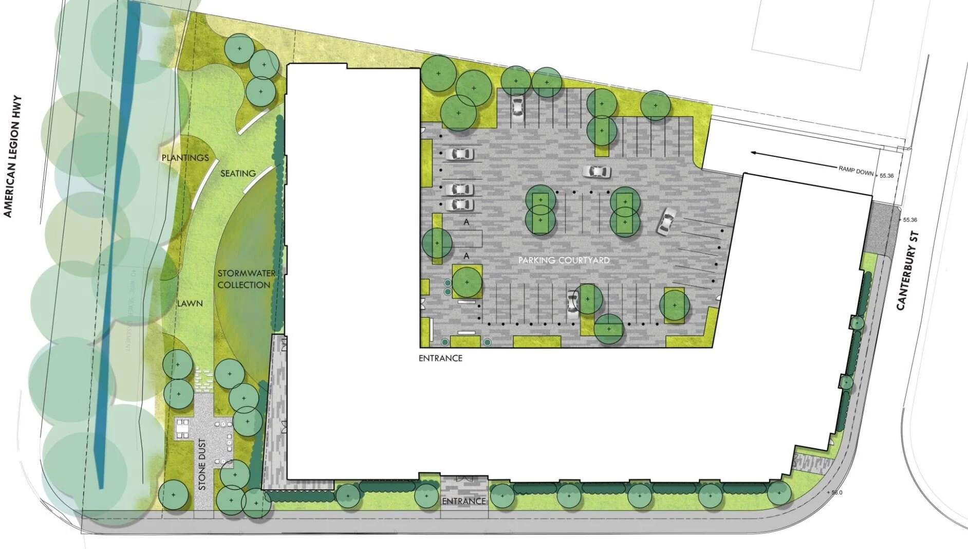 A piazza styled courtyard has be designed to both house necessary parking but also an open space for activities and outdoor gathering in the center of the